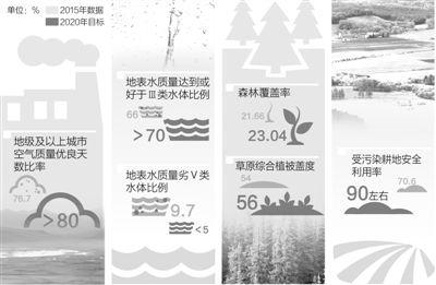 规划提出约束性和预期性指标,其中约束性指标12项,分别是地级及以上城市空气质量优良天数比率、细颗粒物未达标地级及以上城市浓度下降、地表水质量达到或好于Ⅲ类水体比例、地表水质量劣Ⅴ类水体比例、森林覆盖率、森林蓄积量、受污染耕地安全利用率、污染地块安全利用率,以及化学需氧量、氨氮、二氧化硫、氮氧化物污染物排放总量减少。