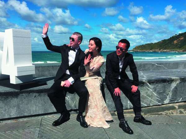2016年9月18日,西班牙第64届圣塞巴斯蒂安国际电影节,冯小刚、范冰冰、王中磊海边合影。