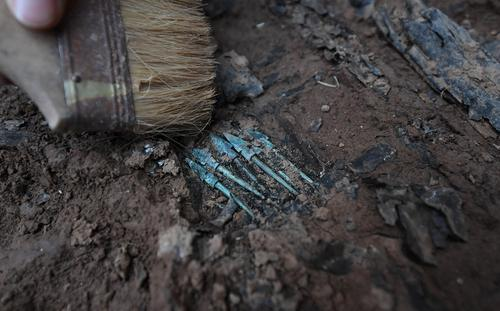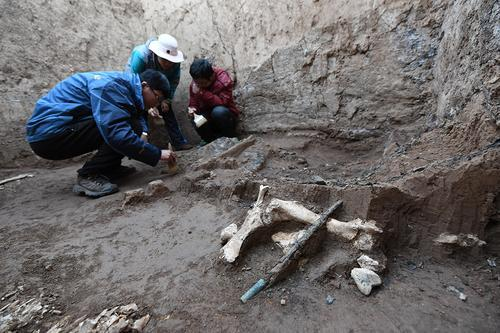 记者发现,在数量密布而种类多样的大小祭祀坑之中,考古发现了马、牛、羊的牲肉埋葬坑,及不同形制的“车马”祭祀坑。初步统计,目前在各类祭祀坑中已出土器物2000余件(组),主要有玉器、青铜车马器及小型木质车马等,都是专门用于祭祀之物。