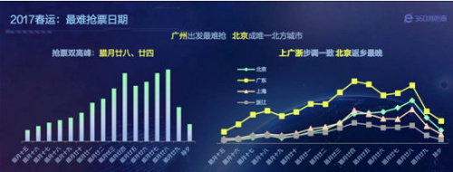 基于对历年春运抢票大数据的分析,360浏览器预计,2017年最难抢的回家车票将出现在腊月廿八(2017年1月25日),其次是腊月廿四(2017年1月21日)和腊月廿七(2017年1月24日)。值得一提的是,腊月廿四(2017年1月21日)会出现第一个回乡高峰。因为腊月廿四为周末,和大专院校寒假日期也比较近,学生、务工人员、部分白领上班族等都可能选择这个时间提前回家。而按照30天预售期来推算,最激烈的抢票日期将出现在12月23日和27日。