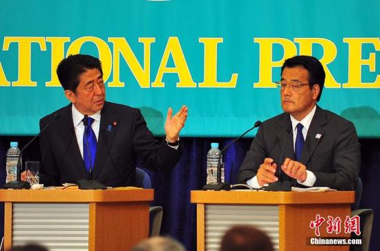 资料图:日本首相安倍安倍与最大在野党民进党的党首冈田克也(图右),在今年6月的辩论会上针锋相对。中新社记者 王健 摄
