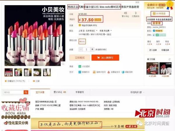 记者在“小贝美妆”随机购买了一款名为“韩国正品代购爱丽小屋唇膏kiss note那时花开想你尹恩惠唇膏”的商品,在商品标题与页面介绍中,店家一直在说明其售卖的商品为“正品”。