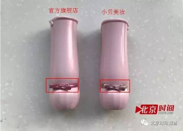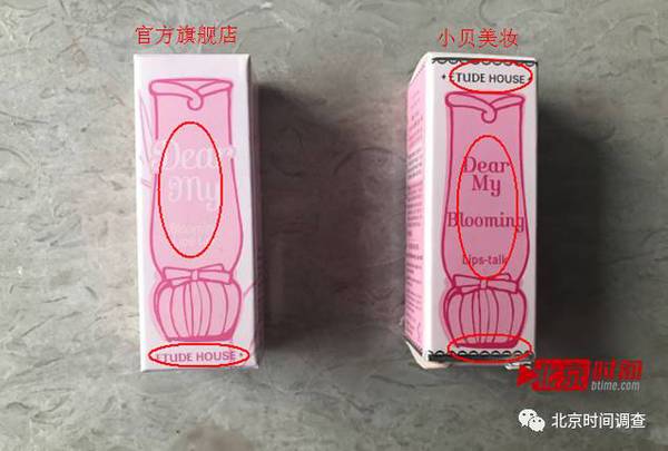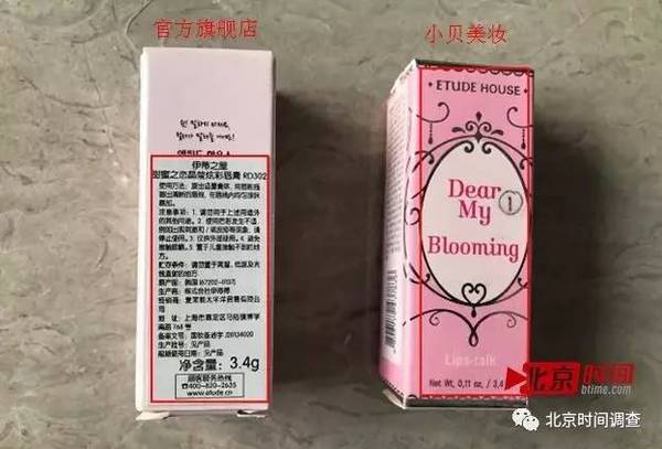伊蒂之屋实体店工作人员表示,天猫“ETUDE HOUSE伊蒂之屋官方旗舰店”的商品与实体店一致,均为正品。“北京时间”在官方旗舰店下单购买了同款“kiss note 那时花开唇膏”,两者对比发现,二者存在明显差异。