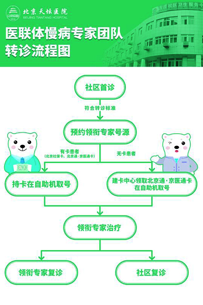 为了确保医联体慢病专家团队服务模式更好地发挥作用,三级医院领衔专家在本院出诊的专家号,将优先向社区的团队成员医生投放?;颊呦仍谏缜驼铮饩龀<?、多发、一般病情,遇疑难问题,社区团队医生因为更熟悉和了解三级医院领衔专家的专业特长、所在科室的特色优势和医院的资源,将依据病情向三级医院更精准更快捷地转诊患者。这种转诊服务,不仅方便患者,而且减少了优质专家资源的浪费。社区和三级医院之间的转诊,将通过北京市医院管理局社区转诊预约挂号平台实现。具体流程是:社区医师根据病情需要,将疑难病患者通过平台预留号源,直接转诊至合作三级医院的专家。转诊预约成功的患者,只需要在就诊当日约定时间内,到三级医院自助机上完成缴费取号即可就诊,极大地简化了转诊流程,方便了患者。
