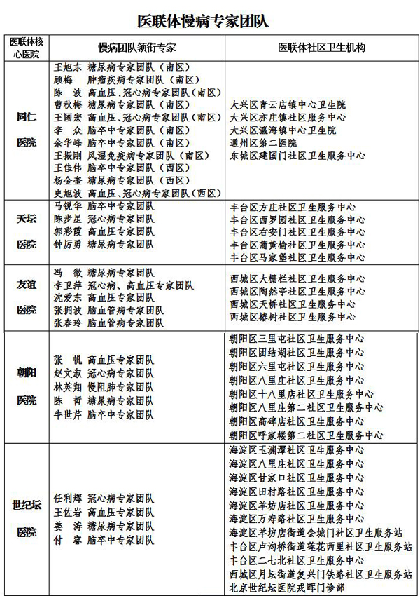 首批试点工作以高血压、糖尿病、冠心病、脑卒中等慢病为重点领域,朝阳医院在4类慢病之外增加适合本院专业特色的慢性阻塞性肺疾病专家团队,同仁医院增加肿瘤、风湿免疫病等专家团队来满足患者的需求。
