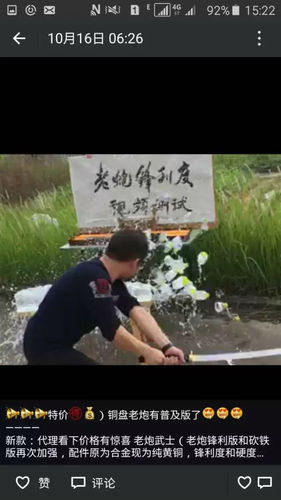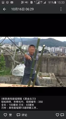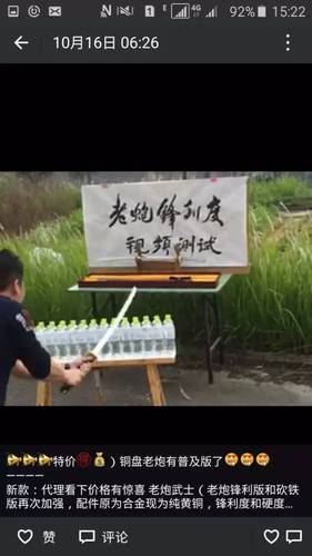 在卖家的朋友圈里,还附有许多试用的小视频——只见试用者持枪瞄准,大约十米开外的啤酒瓶应声破碎,啤酒撒了一地。记者细细翻起每一段视频,让人不禁冒出一身冷汗。在一段视频中,一名男子双手举着一把太刀,面前一张长凳上摆着一排矿泉水,后面立着一个牌子,上面写着“锋利度视频测试”几个大字。只见这名男子放低身形,双手持刀,从左至右一个横削,十几瓶矿泉水齐刷刷被砍成两半??杉庵痔恫⒎巧痰曛谐鍪鄣墓ひ掌?,如此的锋利度,简直堪称凶器。