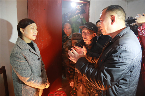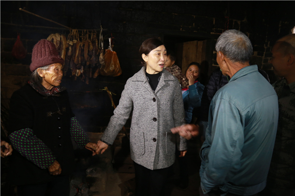 从罗家宝的家出来,李微微走进了一户邻居家,看到一位97岁的老太太正在挂满腊肉的炭火前取暖,李微微亲切地向她问好,并叮嘱村干部要多关心老人家的生活。