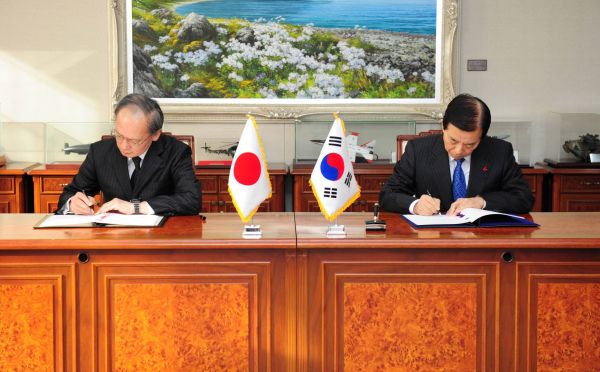 资料图片:2016年11月23日,韩日两国在首尔正式签署韩日《军事情报?;ばā罚谝暗澈秃裰诜追锥源吮硎究挂?。新华社发