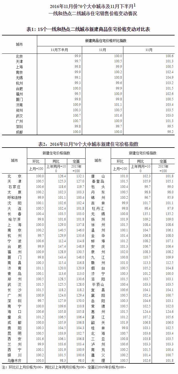 为深入反映房地产市场近期变化,国家统计局在做好11月份70个大中城市房价统计的同时,又对其中15个一线和热点二线城市11月下半月房价变动情况进行了统计。