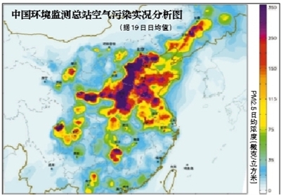 监测显示,16日起,重污染首先在京津冀及周边区域中南部开始发生并积累。至20日9时,中东部的重污染过程仍在持续,中东部14省份82个城市出现重度及以上污染,其中包括北京、河北石家庄、邯郸、邢台、唐山、山西临汾、晋城等46个城市出现了严重污染。
