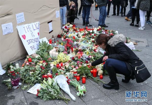 12月20日,在德国首都柏林,一名女子在圣诞集市袭击案事发地点附近放置蜡烛,悼念遇难者。当日,柏林多地举行活动悼念圣诞集市袭击案遇难者。柏林19日发生货车冲入圣诞集市的恐怖袭击事件,造成至少12人死亡、49人受伤。新华社记者单宇琦摄