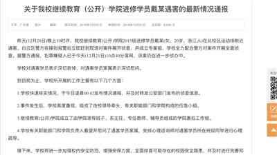昨日上午,广外在官方网站发布通报称,20日晚10时许,学校继续教育(公开)学院2015级进修学员戴某(女,20岁,浙江人),在北校区操场与13栋学生宿舍之间区域遇害。