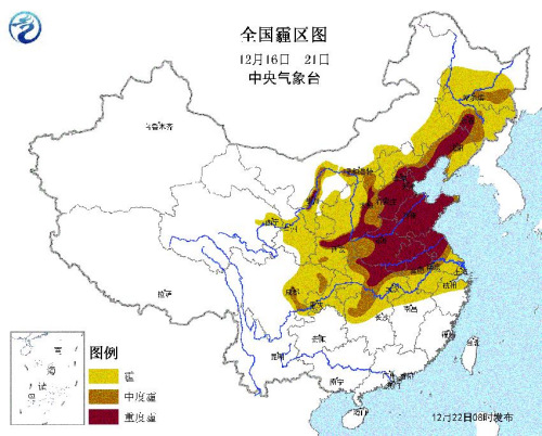 12月16日至21日,中国中东部地区经历了今年范围最广、持续时间最长、强度最强的一次霾天气过程?;?、黄淮及其周边共13个省(市、区)出现重度霾,霾影响区域面积达到268万平方公里,超过中国四分之一的国土面积。截至22日,华北、黄淮等地的霾天气已经明显减弱或消散。