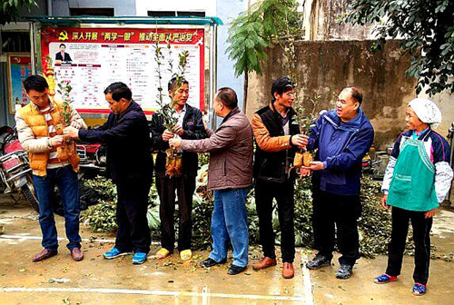图为李正荣(右四)和谭邦敏(左二)把果树苗送到联系户手上。