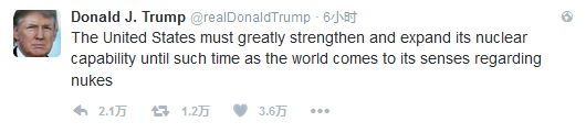 特朗普发推,“在整个世界意识到有核武器这回事之前,美国将大力的发展和延伸它的核力量”