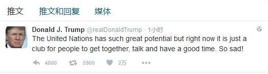特朗普在社交网站“推特”上发文称:“联合国本身具有巨大的潜力,但它现在却成为了一个俱乐部,只供人们聚在一起,玩玩乐乐,实在是太可悲了!”。