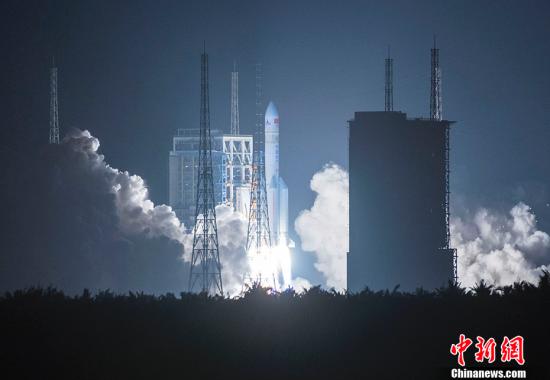 资料图:11月3日20时43分,中国最大推力新一代运载火箭长征五号,在中国文昌航天发射场点火升空,约30分钟后,载荷组合体与火箭成功分离,进入预定轨道,长征五号运载火箭首次发射任务取得圆满成功。 中新社记者 骆云飞 摄