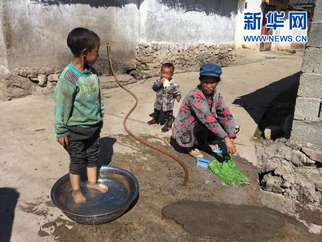 一位布拖县农村的小男孩在家门口洗脚,他的母亲正在洗衣服。