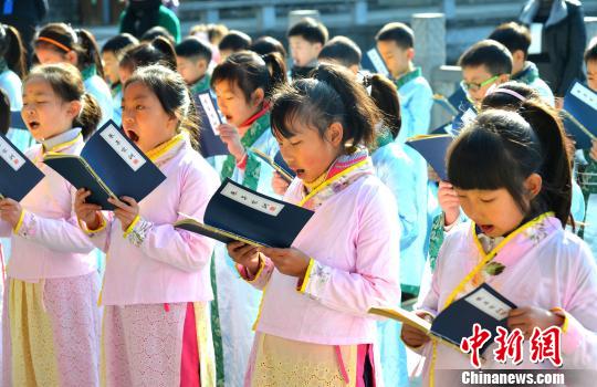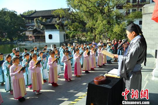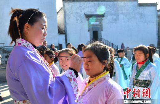 学童们身着汉服,在老师的带领下依次完成朱砂开智等礼仪。 程新德 摄