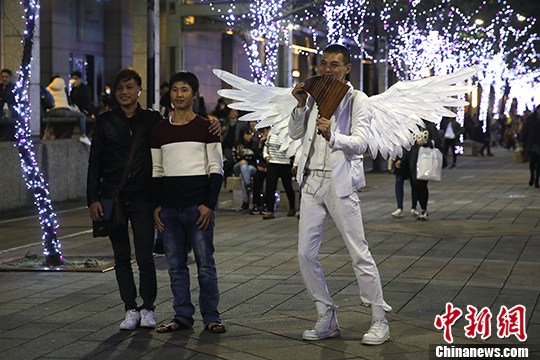 新年愿望是“把竹排笛推广到全世界”的街头艺人唐子骐,早早就来到烟火秀人潮汇聚的街道,着“天使”装扮、为路人吹奏《外婆的澎湖湾》等华语歌坛耳熟能详的乐曲。唐说,用音乐跨年,希望有越来越多的人喜欢他。