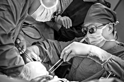 北京友谊医院肝移植中心主任朱志军教授(右)为肝糖原累积症患儿进行亲体肝脏移植手术。新华社发