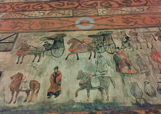 《车马出行图》展开后,全长87.4厘米,宽5.2厘米,画中用土黄、桔红、海蓝和棕色四种颜色,一共描绘出了26个人物、两驾骖车、两驾骈车,骖车指的是三马驾车,而骈车是指二马驾车。