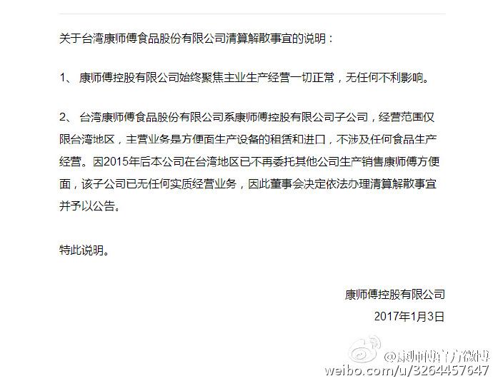 1月3日,康师傅控股有限公司通过康师傅官方微博发表声明表示,公司始终聚焦主业,生产经营一切正常,对大陆市场无任何不利影响,内容如下: