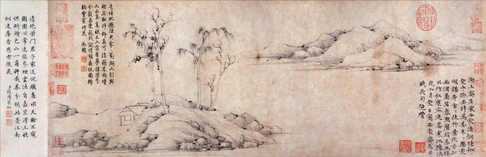 元代画家们开始把很长的款书题写在画上。它强调了绘画的非形象特点,使作品变成一种个人自传性质的记录?;腋鋈说谋硐直涞貌蝗葜靡?。