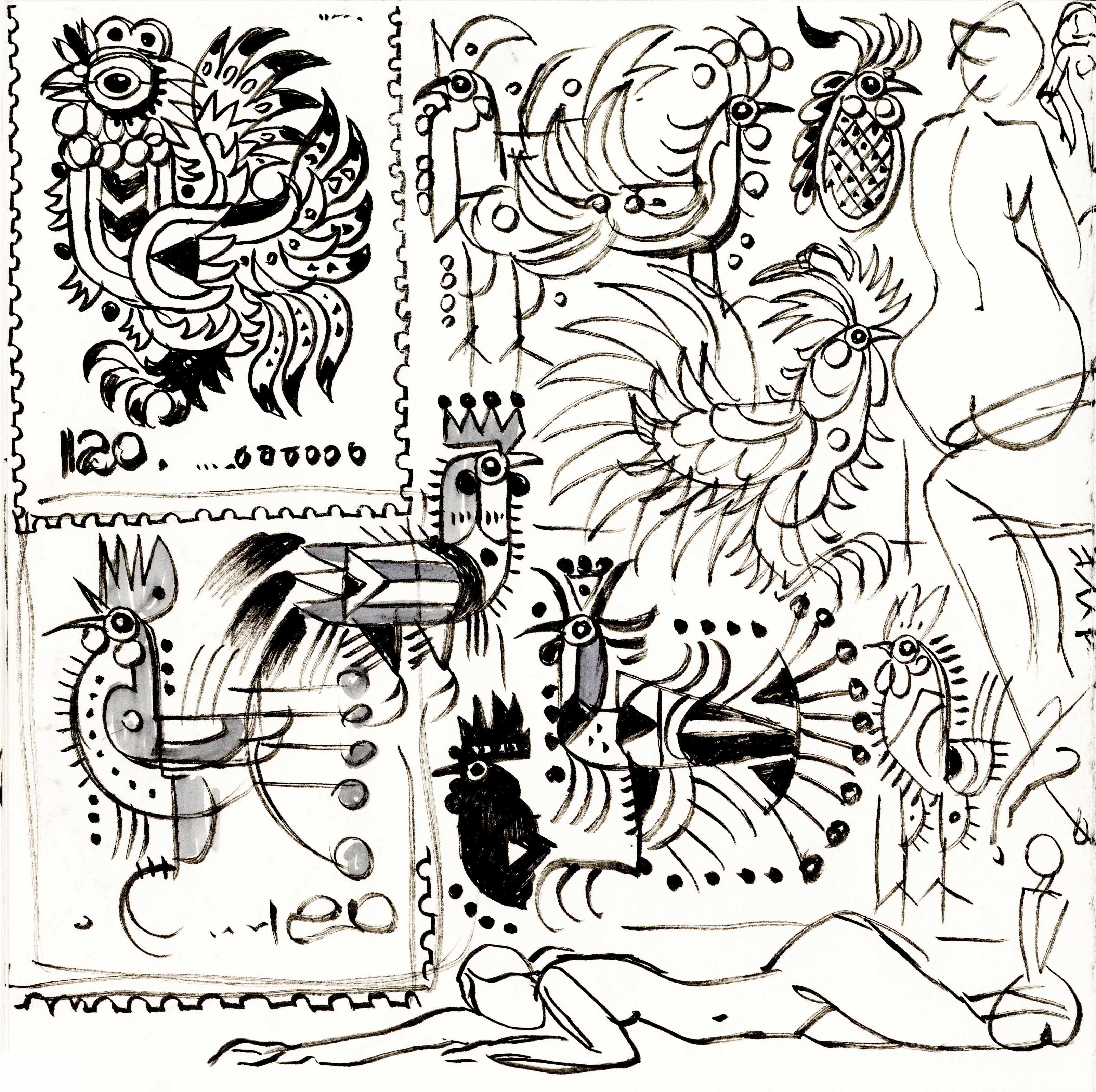 其实,据不完全统计,算上草稿,这些年来,他已经创作了数以万计关于“鸡”形象的作品。