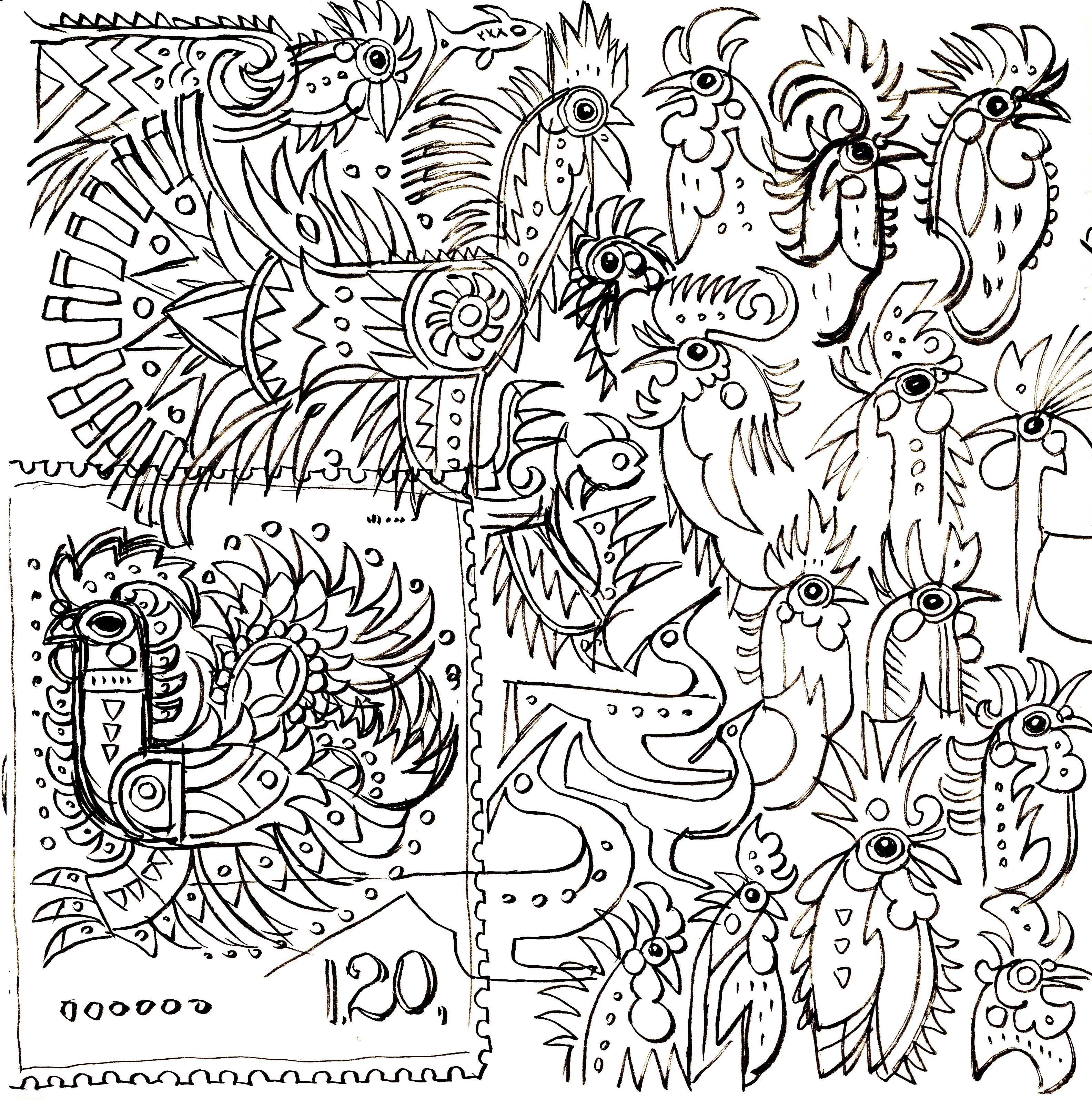 早在1983年,因为山东人民出版社出版《百鸡图》,韩美林就曾一气呵成创作过一系列以鸡为内容的美术作品,作为他在艺术形式、色彩、造型上的探索。时隔33年之后,韩美林再度创作新《百鸡图》,而此次丁酉年生肖鸡票的图案,其实也可以说是从这些代表大吉大利的“鸡”的形象中精选而来。