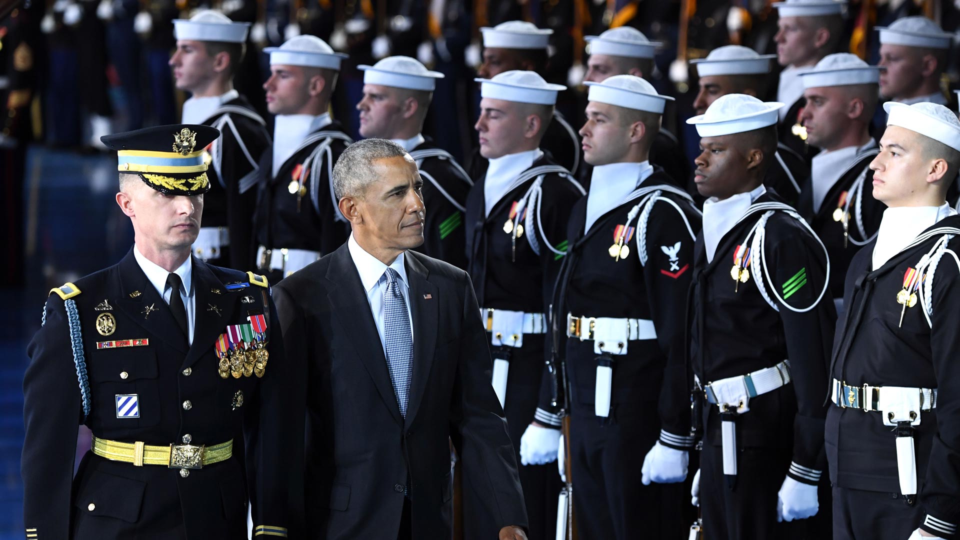 1月4日,在美国首都华盛顿附近的迈尔·亨德森军事基地,美国总统奥巴马(前左二)出席军方为他举行的欢送仪式。当日,美国国防部长卡特和美军参谋长联席会议主席邓福德为即将卸任的美国总统奥巴马举行欢送仪式。 新华社记者 殷博古 摄