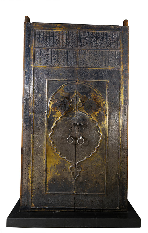 在这样的背景之下,奥斯曼苏丹艾哈迈德(公元1603—1617年)定期向天房捐赠物品。这件镀金大木门由奥斯曼苏丹穆拉德四世(公元1623—1640年在位)捐赠,曾立于克尔白天房内室门口。该门板的木质板芯上有镀金和包银装饰。