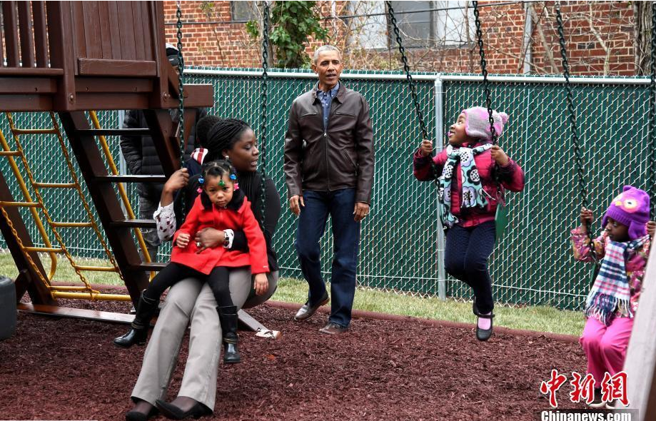 当地时间2017年1月16日,美国华盛顿,美国总统奥巴马和第一夫人米歇尔参加庇护所的服务活动,帮助绘画马丁路德金的壁画,在自己捐赠的游乐设施陪孩子一起玩秋千,庆祝马丁·路德·金纪念日。