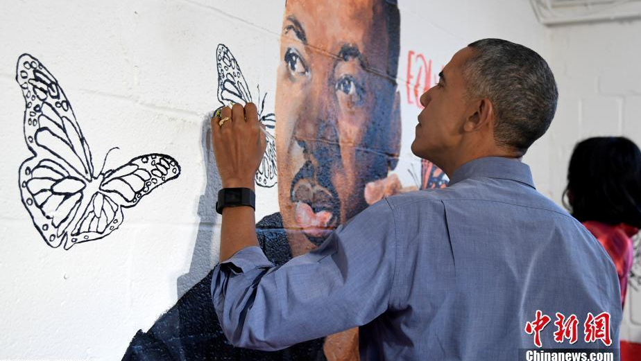 当地时间2017年1月16日,美国华盛顿,美国总统奥巴马和第一夫人米歇尔参加庇护所的服务活动,帮助绘画马丁路德金的壁画,在自己捐赠的游乐设施陪孩子一起玩秋千,庆祝马丁·路德·金纪念日。