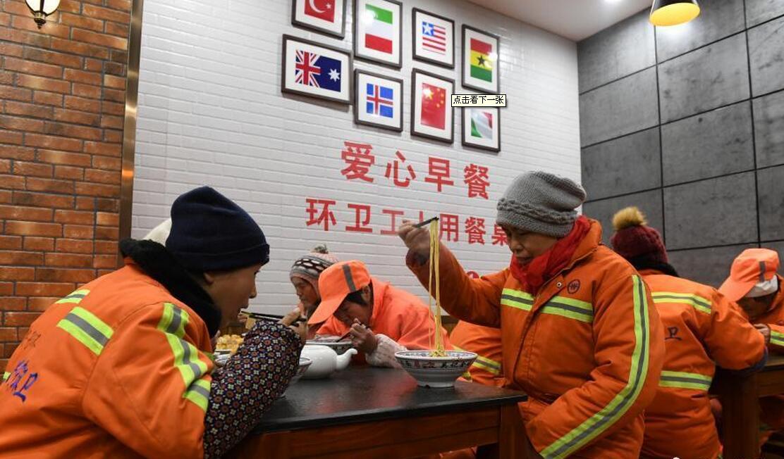 1月19日,兰州市一家牛肉面馆内环卫工人正在享用牛肉面免费早餐。自1月中旬起,兰州市官方启动“爱心早餐”工程,由兰州市城管委与兰州市牛肉面协会协商,动员牛肉面经营企业、经营户参与关爱环卫工人的行动,采取政府出资、企业让利的方式,为一线环卫工人提供“爱心早餐”。据兰州市城管委介绍,兰州市现有9014名环卫工人,为他们提供的“爱心早餐”将纳入政府每年的财政预算,作为一项民生工程持续开展下去。中新社记者 杨艳敏 摄