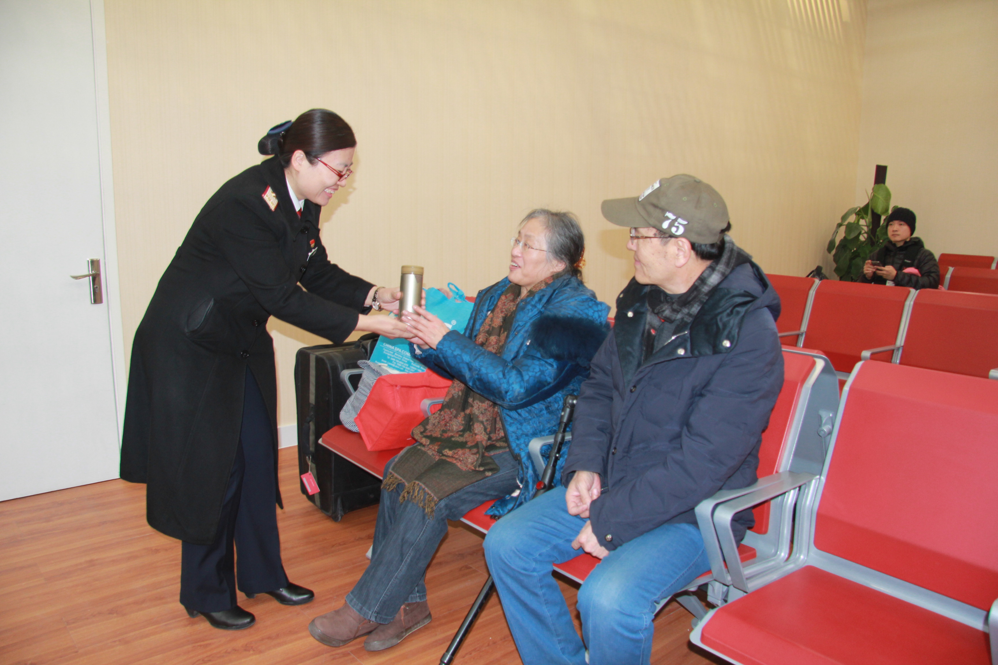 记者采访时,全国劳动模范、润秋爱心服务区负责人张润秋正在给一对老夫妇打开水。这对老夫妇是山东烟台人,一直在北京给儿子照看孩子,每年暑假和春节都要回老家?!澳昙痛罅?,喜欢清静,所以每次来南站之前都会向润秋爱心服务区预约,他们既负责接送,还给买票、取票,很热心?!?/p>