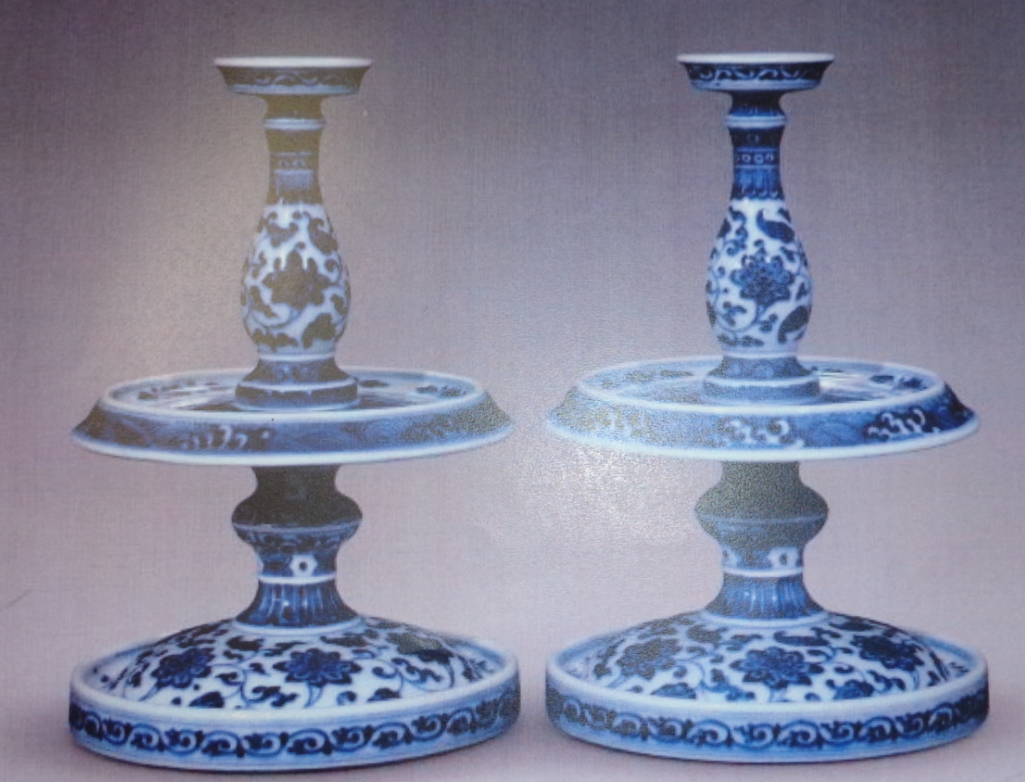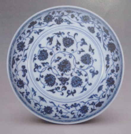 明代的莲花图像装饰性很强,无论是造型还是构图,都达到了非常精致沉稳的程度,这时期的艺术特征是端庄敦厚富贵却不浮华。明代在继承宋元时期的莲纹装饰基础上,对莲纹装饰有了更多的变化,多以缠枝、串枝形式装饰器物。缠枝莲纹图案的构图优美,枝叶连绵起伏、节外生枝、枝外生节,花叶都作了装饰性的改变。连绵起伏的缠枝莲,仿佛是莲花的根长茎、茎生叶、叶长花而代代相传、生生不息的生长特点。缠枝莲花纹的装饰有着各种不同的形态,有的是以缠枝莲纹为图案的花瓶和圆盘,有的是在缠枝莲花纹之中,以“暗八仙、八宝”等图案来衬托。除了单纯的缠枝纹外,还出现了大量与莲纹合绘的图案装饰于陶瓷器皿的表面,如龙穿莲、凤穿莲、缠枝莲托八宝、缠枝莲托梵文等。这一时期的莲花纹饰中莲瓣较宽大,排列渐紧,瓣与瓣间空隙渐小,以至于无,莲瓣完全连在一起。