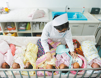 全面放开二孩政策以来,很多高龄妇女加入了生二孩的队伍,各地医院产科迎来婴儿出生潮。图为春节前夕,湖北襄阳第一人民医院产科护士在护理新生儿。