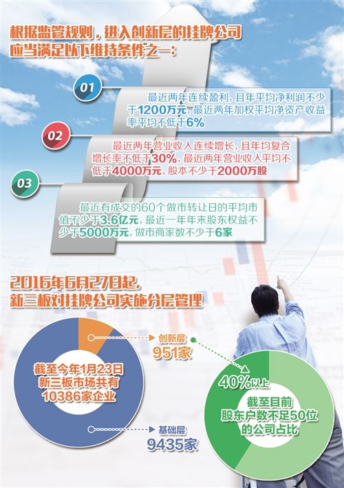 从2016年6月27日起,新三板对挂牌公司实施分层管理。截至今年1月23日,新三板市场共有10386家企业,其中创新层有951家,基础层有9435家。根据分层标准及维持标准,新三板于每年5月份最后一个交易周的首个转让日调整挂牌公司所属层级(进入创新层不满6个月的挂牌公司不作层级调整)?;〔愎遗乒救绶洗葱虏闾跫?可调整进入创新层;不符合创新层维持条件的挂牌公司,调整进入基础层。