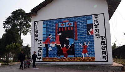 四川南充市高坪区东观镇大石头村五组村民正漫步在文化墙旁。东观镇在全镇30面民宅墙头画有“新风正气”“社会主义核心价值观”等内容,达近千平方米,为乡村民宅增添了文化气息。人民视觉
