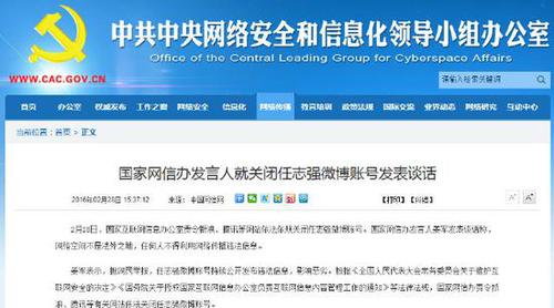 2016年2月28日,中央网信办责令有关网站关闭任志强微博,称任志强微博持续公开发布违法信息,影响恶劣。
