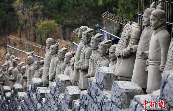 2017年2月8日,安徽安庆市太湖县, 五千年文博园景区内,中国最大山寨“兵马俑”群整齐划一,上千个“兵马俑”场面震撼。一个个兵马俑惟妙惟肖,古朴自然,吸引了不少游客专程参观。根据导游介绍,该“兵马俑”群完全按照西安临潼兵马俑一号坑原比例复制而成,五千年文博园景区门票为120元,这个规模宏大的“兵马俑”群,就是为了让游人感受秦朝的文化风情。