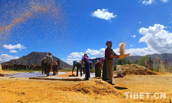 青藏高原上,正在忙着享受秋收快乐的村民。