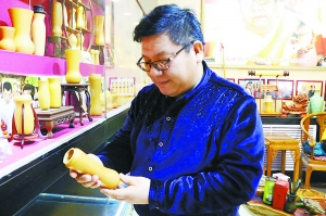除了在展会上会有一些初学者向张福来请教技法以外,还有不少通过网络或是慕名前来拜师学艺的人。如今,张福来的徒弟遍及全国,不少已经成为了砑花葫芦界颇有名气的手艺人,谈及自己的徒弟,张福来告诉北京商报记者:“与徒弟们结识全是靠缘分,我从不收取学费,但有一个要求就是必须要尊师重道,对于有意拜入门下的年轻人,我总是会先考察一两年的时间再将其收入门下,还没出师的时候,外地的徒弟们通常是每周来一次,然后给他们留作业,再通过网络交流?!敝档靡惶岬氖牵鸥@吹耐降苊遣唤鼋鍪悄切┮皂蓟ê氖忠杖?,还不乏一些普通的砑花葫芦爱好者,张福来正是用这种方式,让越来越多的人认识和了解砑花葫芦。记者 马嘉会 实习记者 宗泳杉