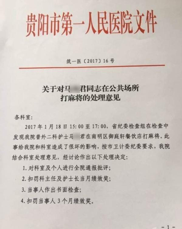2月10日上午,一份由贵阳市第一人民医院下发的《关于对马某君同志在公共场所打麻将的处理意见》文件在网络热传,文件内容显示,2017年1月18日15时至17时,贵州省纪委检查组在检查中发现贵阳市第一人民医院普外二科护士马某君在南明区御庭轩餐饮店打麻将,给医院和科室造成了很坏的影响。