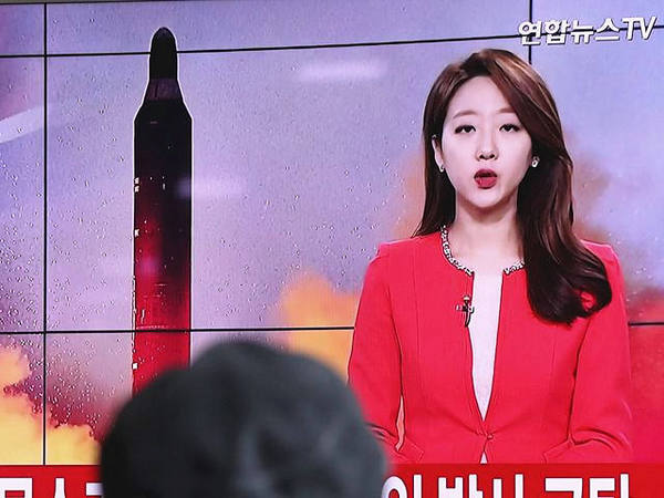 首尔火车站,电视播放着朝鲜试射弹道导弹新闻。(新华/美联)