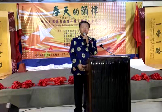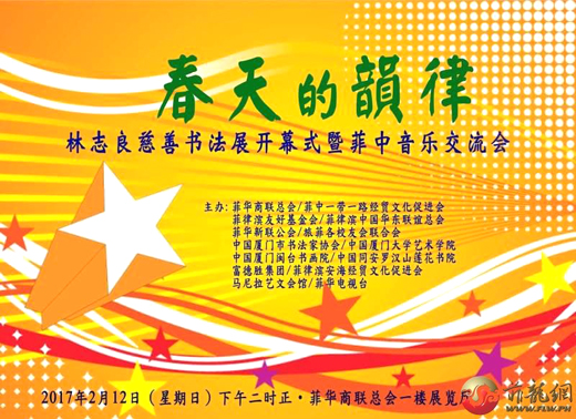 由中国驻菲律滨大使馆主催,由菲中机构菲华商联总会、菲中一带一路经贸文化促进会、菲律滨友好基金会、菲律滨中国华东联谊总会、菲华新联公会、旅菲各校友会联合会、中国厦门市书法家协会、中国厦门大学艺术学院、中国厦门闽台书画院、中国同安罗汉山莲花书院、富德胜集团、菲律滨安海经贸文化促进会、马尼拉艺文会馆、菲华电视台联合主办的《春天的韵律---林志良慈善书法展暨菲中音乐交流会》于2月12日下午在菲华商联总会一楼展览厅正式开幕!