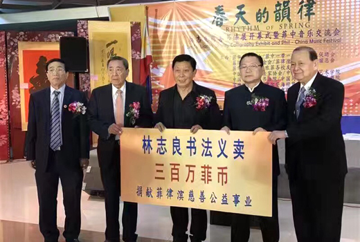 中华人民共和国驻菲律宾共和国特命全权大使赵鉴华阁下、菲律宾总统中国特使施恭旗先生、菲律宾宋庆龄基金会创会会长陈祖昌先生等多位在菲知名华人参与开幕剪彩!活动现场,林志良院长向菲总统杜特尔特赠送的《亲民》、《中菲友谊万古长青》两幅作品分别由中国驻菲大使赵鉴华阁下以及总统经济事务特别顾问杨鸿明先生代表接受!林志良院长现场义卖超三百万元菲币,全部捐于菲律宾慈善事业!随后莲花书院艺术团与菲律宾多位音乐爱好者同台演绎,唱响鸡年的第一声春雷!