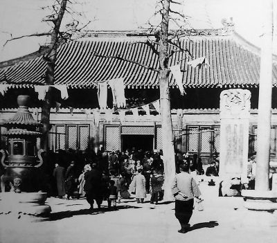 庙会一直延伸到寺庙里面。在第一大殿“天王殿”后面,是一进二院的东门,东边南侧厢房第一家是“逹真照相馆”、东配殿是“骄子铺”。每个摊位上有布棚,南北连成一片,能为游人蔽荫。这里卖布匹、料子、衣服鞋帽、梳头篦子等日用品,还有戏剧脸谱面具、小腰鼓、小铜锣、小铜镲各种玩具。要是赶上春节,这里就更热闹,大糖葫芦、灯笼、走马灯、年画等红红火火,增添了节日的热闹气氛。我记得春节时,这里卖一种特别好玩的“玩意儿”:它是用玻璃吹制而成的,像个喇叭,底部做得很薄,上面正中处有一个细长的吹口,对着它一吹一吸,底部就会发出“噗噔噗噔”的声音,连续吸吹,便响个不停。这个工艺已经消失了近六十多年了。
