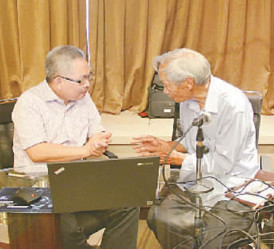 2014年6月,广东东莞文史专家杨宝霖接受庄初升(左)有关木鱼歌的访谈。